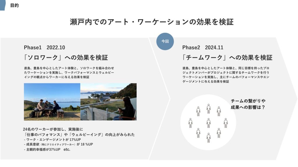そして今年、同社は引き続き「瀬戸内国際芸術祭 2025」のパートナーとして、ワーケーションの実証実験を実施。今回は「チームワーク」にフォーカスし、ワークショップを取り入れながらチームのパフォーマンスやエンゲージメントに与える具体的な影響の可視化に取り組んだとしています。