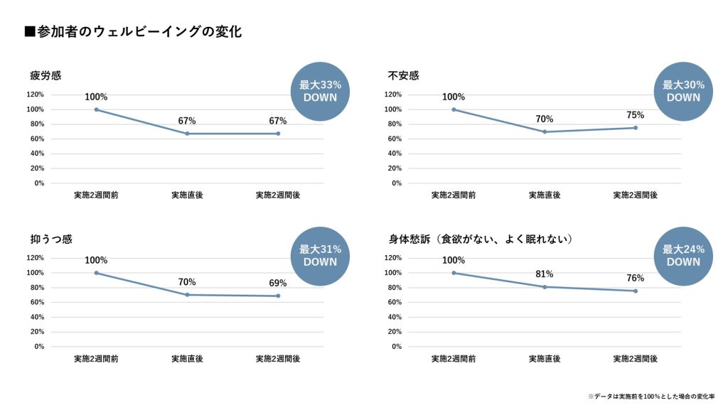 最初に注目すべきは、参加者のストレス指標に大きな変化が見られた点だといいます。疲労感、不安感、抑うつ感、身体愁訴(食欲不振や睡眠障害など)は実施直後から大幅に軽減され、2週間後もその効果は持続していたとしています。具体的には、実施後に最大で疲労感が33%、不安感が30%、抑うつ感が31%、身体的愁訴(食欲がない、よく眠れない)が24%の減少という結果が得られたとしています。