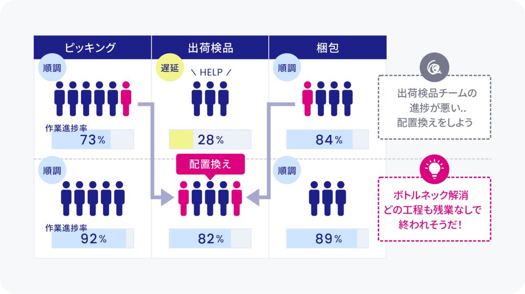 入荷から出荷までの作業進捗をリアルタイムで可視化し、効率的な人員配置や迅速な対応を実現するといいます。作業者一人ひとりのスキルや稼働状況もデータ管理できるとしています。