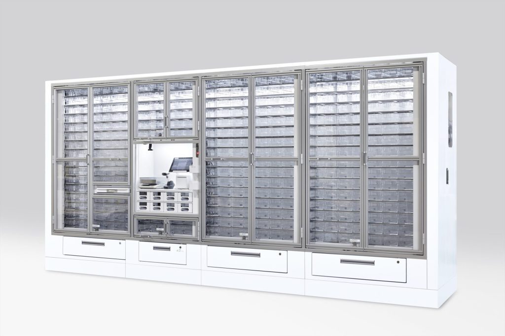 本メーカーは半世紀以上、自動倉庫のピッキング技術を磨いてきた実績を持ち、その蓄積を生かして開発された薬剤のピッキング機器である。設置環境に配慮した薄型・コンパクト設計で、薬棚に溶け込むフラットな面構成で凹凸を抑えた実直なデザインは、現場の動線や清掃性にも配慮されている。本体には8つの引き出しを備え、点滅表示で取り出し箇所を案内することで、取り違いを防ぐ仕掛けになっている。これらにより調剤の一部を半自動化し、薬剤師が患者と向き合う時間を確保できる。薬剤師の働き方も変わる次の社会に向けての素晴らしい提案である。
