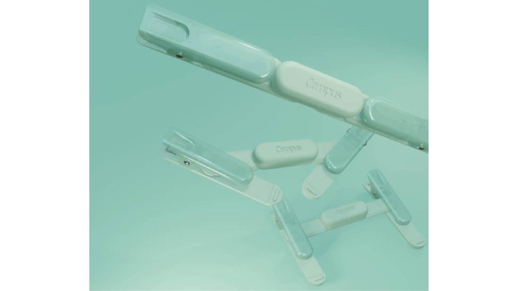 このブッククリップはコンパクトな形状が特徴だといいます。左右のクリップが軸を中心に回転することで、ペン型から従来のクリップ型へと変形するとしています。また、左右のクリップが独立して動くため、様々なページの厚みに対応可能だといいます。学生の勉強場所が多様化している現在、持ち運びやすさが新たな価値を提供するとしています。
