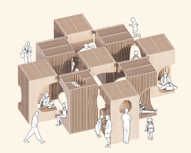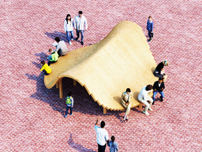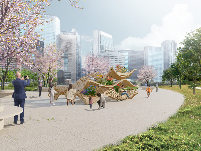 日本の伝統的な「縁側」を、地層から着想を得た積層木材構造として再解釈した「Strata Engawa」。等高線のような自然な形状は、座る、寝転ぶ、集うなど多様な過ごし方を誘う機能的なプラットフォームとなる。アシンメトリーな構造により、瞑想に適した個人的な空間と、家族連れが楽しめる開放的なエリアを両立させた。温かい木肌が自然との一体感を高め、静かな思索と人々の交流が共存する場を創り出す。