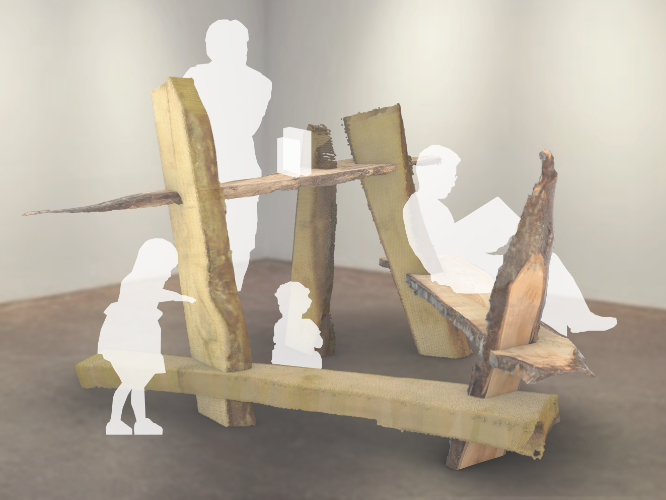 様々な樹種の自然木板材を加工し組み立て、ひとつの構築物を制作するシステムとかたちのデザインの提案。3軸CNC加工による簡易的な接合部で構成可能な全体の幾何学に則り、色や形、木目や産地が異なる多様な個性を持った自然木は集まり、小さな森を形成する。再構成された板材は、空間における位置やスケールに応じて新たなふるまいを示す。木に触り、座り、物を置き、五感を通して木と人がつながり、人々はひとつの森に包まれていく。