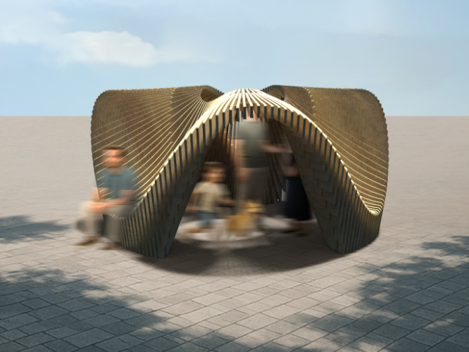 洞窟のようなルーフと屋根に腰掛けるようなベンチが1つのサーフェスとなり、それ自身が構造体となったデザイン。人々は、ルーフ天井の開口から差し込む光に誘われて足を踏み入れ、自然と空を見上げる。光の眩しさや、空に見える何かについて言葉を交わすかもしれない。外側のベンチ部に座る人は、スリットの隙間から漏れ聞こえるそんな会話を聞ききながら、同じ空を眺める。