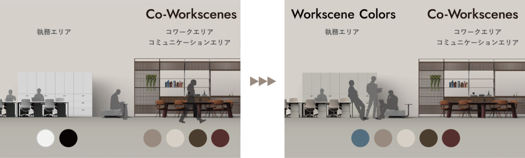 Co-Workscenesが「自然なコミュニケーションや一体感を生む居場所」を支えるのに対し、Workscene Colorsは「働く中心となる場」の質を高め、空間全体を自然につなぐことを目的としているとしています。