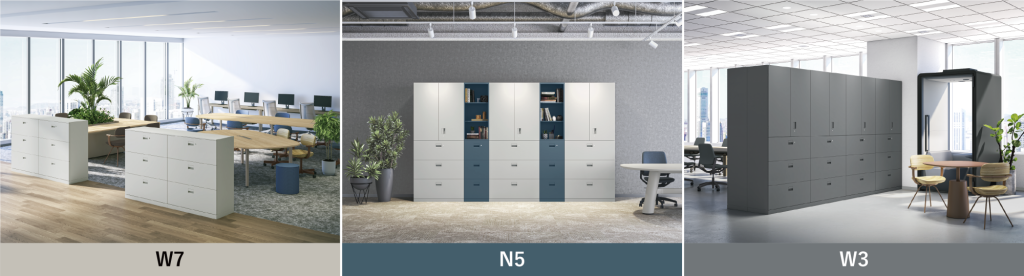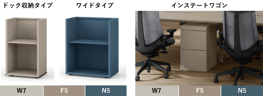 執務エリアの収納については、エスキャビネットにカラーを追加するといいます。メインカラーW7(サテンホワイトグレーW)色を追加するほか、アクセントカラーとしてN5(サテンティールブルー)、壁面になじむ低明度カラーとしてW3(ダークグレーW)を追加。全面サテン調の仕上げとなっているとしています。
