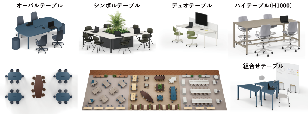 カラー追加に合わせ、多様な執務スタイルに応じた居場所となる機種を追加するといいます。ランダムな動線の創出とチームワークにも適した執務席のオーバルテーブル、止まり木スペースとして使いやすいシンボルテーブル、2人で相談しながら作業しやすいデュオテーブル、コミュニケーションが生まれやすいハイポジションワークスタイルに適したハイテーブル、フレキシブルに組替しやすい組合せテーブルの他、サイズも新たに追加しているとしています。