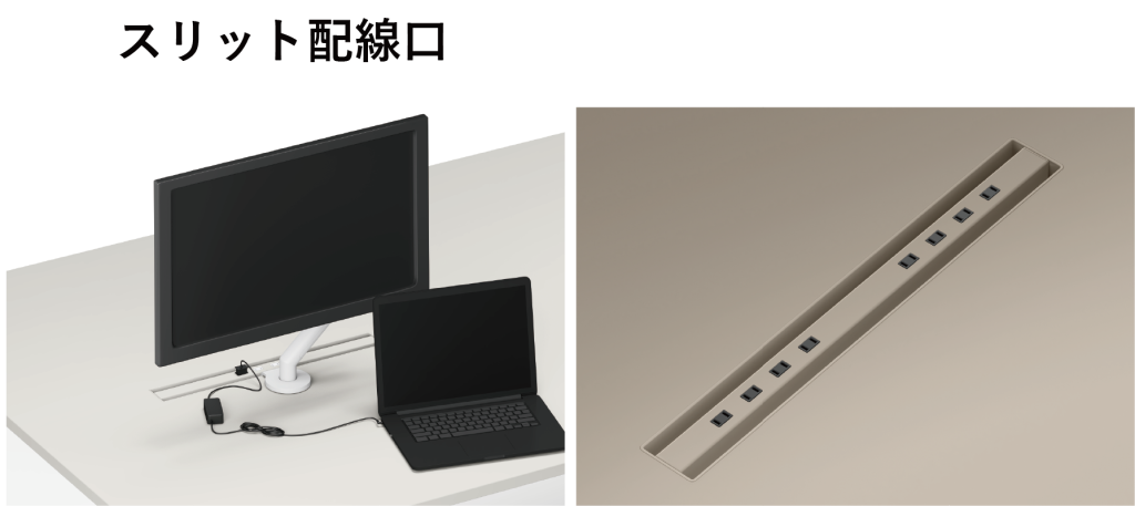 ワークテーブルにはスリット配線口タイプも追加するといいます。横長の細長い形状の配線スリットは、机上面を広く使うことが可能で、モニターを自由な位置にクランプ出来る形状となっており、個人執務をより快適に行うことができるとしています。