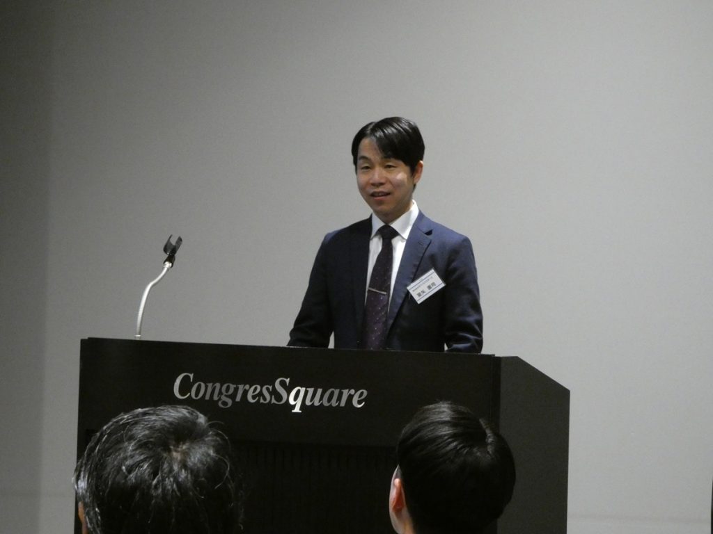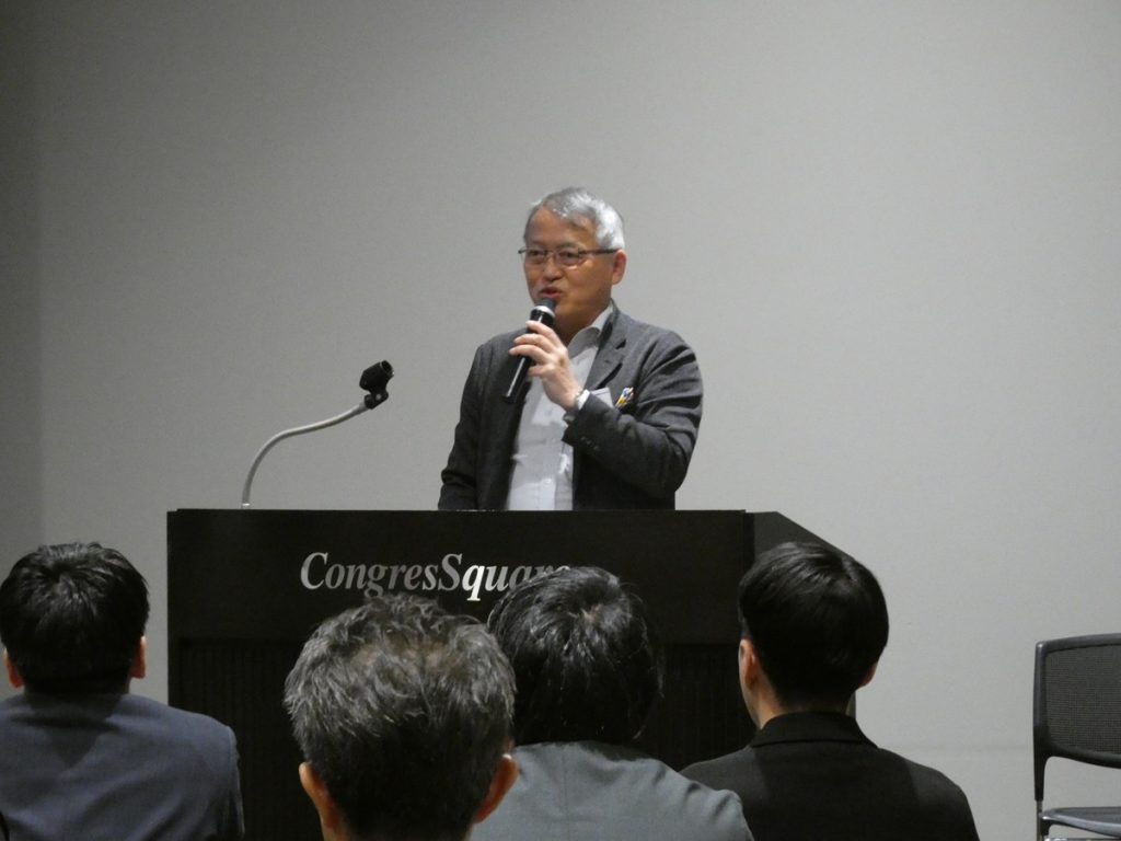 「本日はお忙しい中たくさんの来賓の方にお集まりいただきまして本当にありがとうございます。このFLP、次世代リーダー育成プログラムは今年で4回目。年に1回、半年間集合研修ということになっております。最初始めたときはこの業界になかなかフィットしたこのような教育プログラムがないということで、我々も手探りで始めたのですが、さすがに4回目ということになると中身も充実し、第1回ではDay0 から最終日がDay5だったものが、今回はDay8になっているように、1年目から3日も増えています。それぐらい充実してきました。そういうこともあり、この後皆さんにプレゼンをして頂きますが、この予選のときにも非常に白熱したものが聞けまして非常に面白かったです。後ほどまた皆さんに聞いていただきますが、JOIFAとしては、このような機会を有効に利用していただき、参加者の方、ゲストの方とも交流していただいて、業界全体の発展が実現できればという思いでおりますので、どうぞ最後までお楽しみください」などと述べました。
