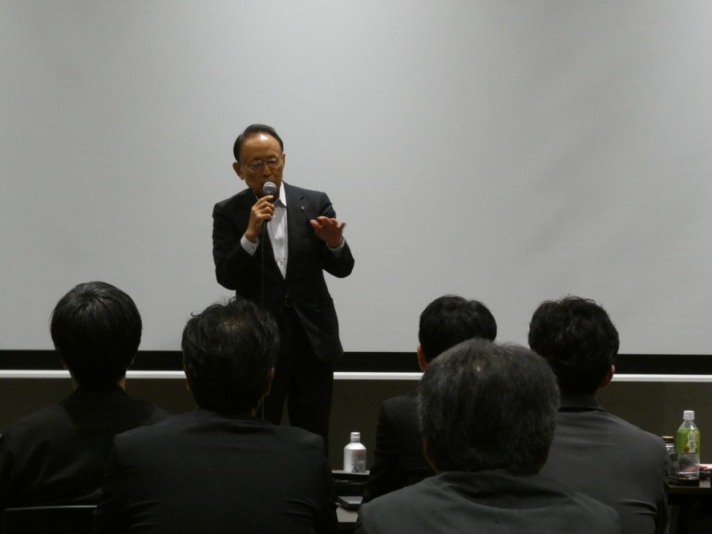 最後になりますが、リーダーとは何なのか。これ大問題なのです。私自身の考えを申し上げますと、リーダーというものの本質は最終的には、人を、他人をといってもよいですが、どのぐらい幸せにするかという、この問題意識、その意識を持ち、それによって行動できるかどうかです。他人をどの位、他をどのくらい幸せにするか。私は最終的にこの一点に絞られると思います。ただこの他という時、他人というときに、まず、最初はやはり家族です。自分の家族。そこでリーダーシップを発揮しなければならない。次はやはり自分の働いている会社ですね。会社をどうやってこの社員をどうやってハッピーにしたらいいかということを絶えず発想する。部下が何人いるのかは関係ない。仮に自分が新入社員でもこの会社どうやって少しでもいい会社にして、少しでも社内をハッピーにするかということを考えながら行動する。これがやはりリーダーの本質です。それが会社からだんだん業界に移る。業界をどうやって。今度は日本経済にどうやってと、だんだんリーダーとしてのスパンが広がっていきます。それからこの国をどうしたらいいかという、この高い視座で本当にリーダーシップを発揮してもらいたい。この国をどうするか。この世界をどうするか。それからさらに大きくすると地球をどうするか。やはり今SDGSとかはそういう発想とはまさにこの地球環境と人間というのは一つの生命体だと私はそう思っているのですけれど、その発想が次第に広がって行く。人を本当に幸せにしようと思うとそこに発想がいくのです。この世界をどうしたらいいか。この自然を、地球をどうしたらいいかとさらに広がっていくと宇宙になっていくわけです。そこまではなかなか大変ですけれども、結論的に申し上げると、私としては、皆さんにリーダーの本質、やはり他人をいかに幸せにできるかそのために絶えずその発想をし、そしてその行動ができるかということに私はその本質があると思いますので、このことを皆さん頭においてこれから行動してほしいと思います。引き続き皆さんのご活躍とそれから業界に関する貢献を期待いたしまして私のメッセージといたします」などと述べエールを贈りました。