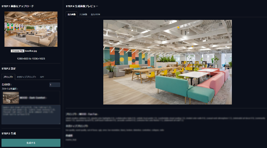 「オフィススタイルAI」は、画像生成AIを使い空間パースや画像を、瞬時にスタイルを変えた画像へ変換するシステムだといいます。顧客が求めるイメージを短時間で画像として可視化することで、顧客価値向上を目指すとしています。