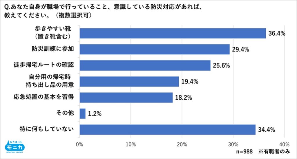 ・職場での個人の防災行動、「歩きやすい靴」が36.4%と最多、一方で未対応層も約3割。