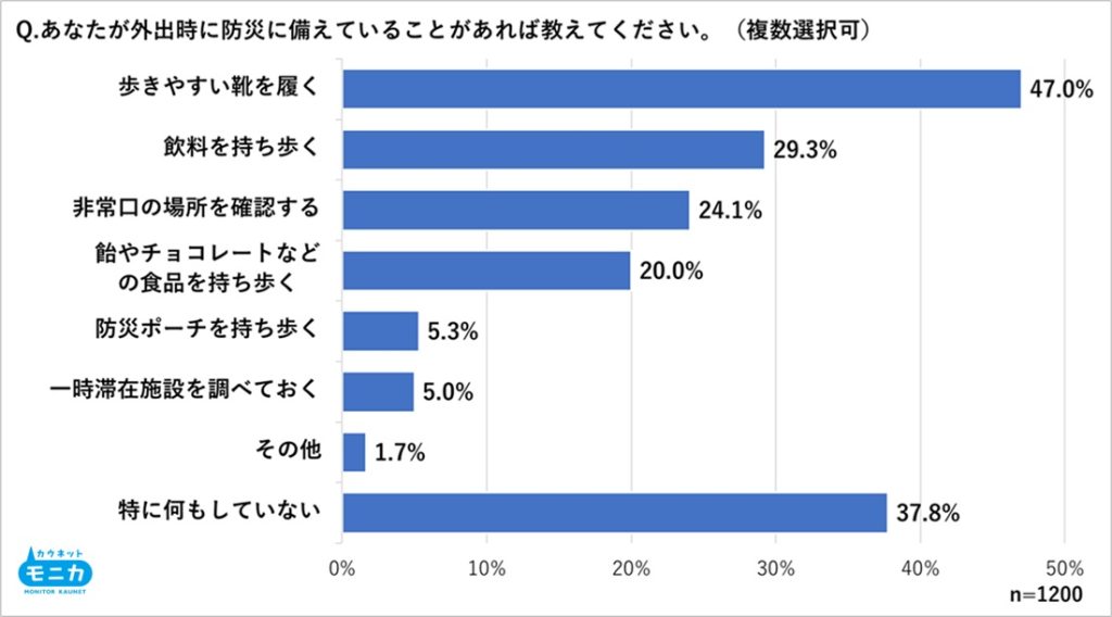 ・外出時の防災対応、「歩きやすい靴を履く」が47.0%と最多、一方で未対応層も約4割。