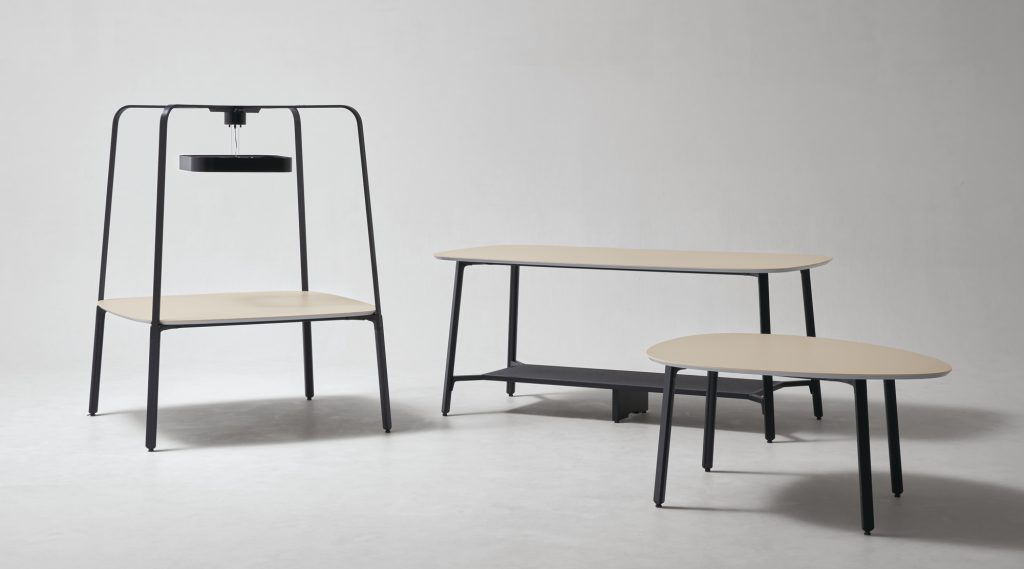 「ワークアイル」は、座席の距離や位置の関係性に着目し、快適な個人作業の場と偶発的なコミュニケーションを生む場の両立を目指したテーブルシリーズだといいます。快適に個人作業を行うための距離を保ちつつテーブルを囲んで座ることで、周囲の人とのコミュニケーションを図り、つながりをはぐくむとしています。座席間の距離がさまざまなラウンドテーブルは、座る位置によって距離を調節でき、テーブルを囲む人数が増えるほど、お互いの距離が複雑になり、思いがけない出会いや会話の発生を期待できるといいます。