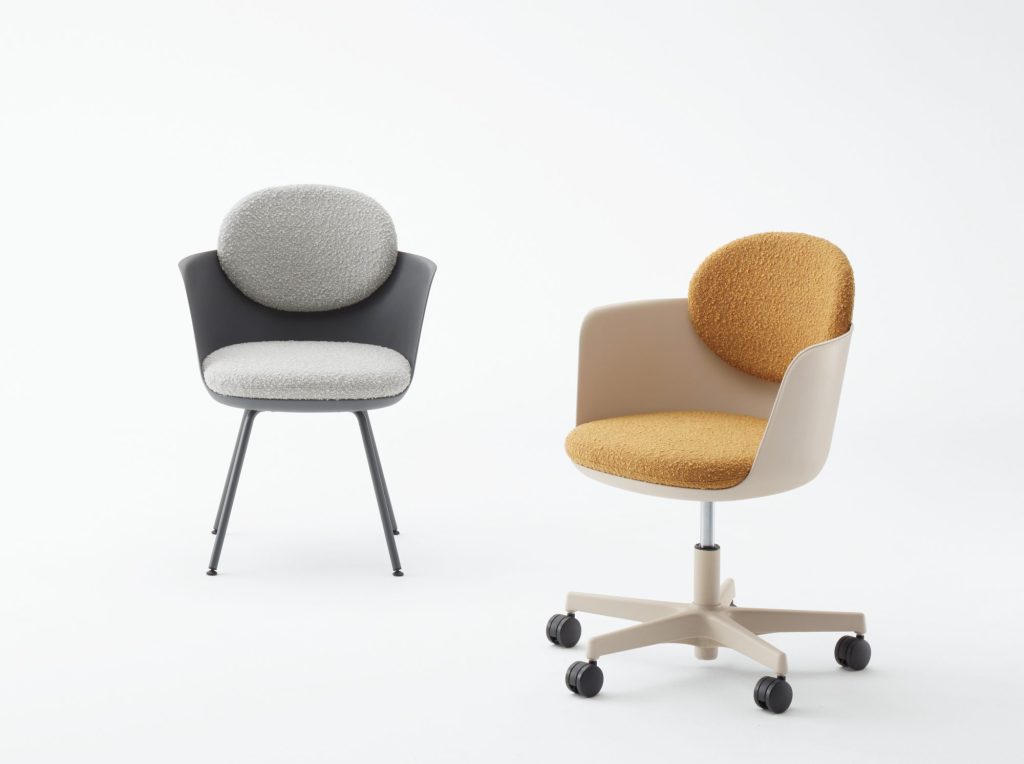 「フローリス」は、軽やかなシェルとボリューム感のある背と座のクッションにより、快適な座り心地と落ち着きのあるデザインを両立したチェアだといいます。シンプルなシェル構造ながら、背もたれのクッションの絶妙なカーブと厚みで身体をしっかりと支え、快適な執務姿勢と座り心地を提供するとしています。肘が触れる部分は外側へ広がる滑らかなアウトラインを描くデザインで、選ぶ張材によって印象も変化し、アクセントとして空間を彩るとしています。張材には風合いのあるファブリックを採用し、リラックスした雰囲気も演出するといいます。ボディカラー、脚タイプ、張材の豊富なバリエーションで、さまざまなレイアウトに高い親和性を発揮するとしています。