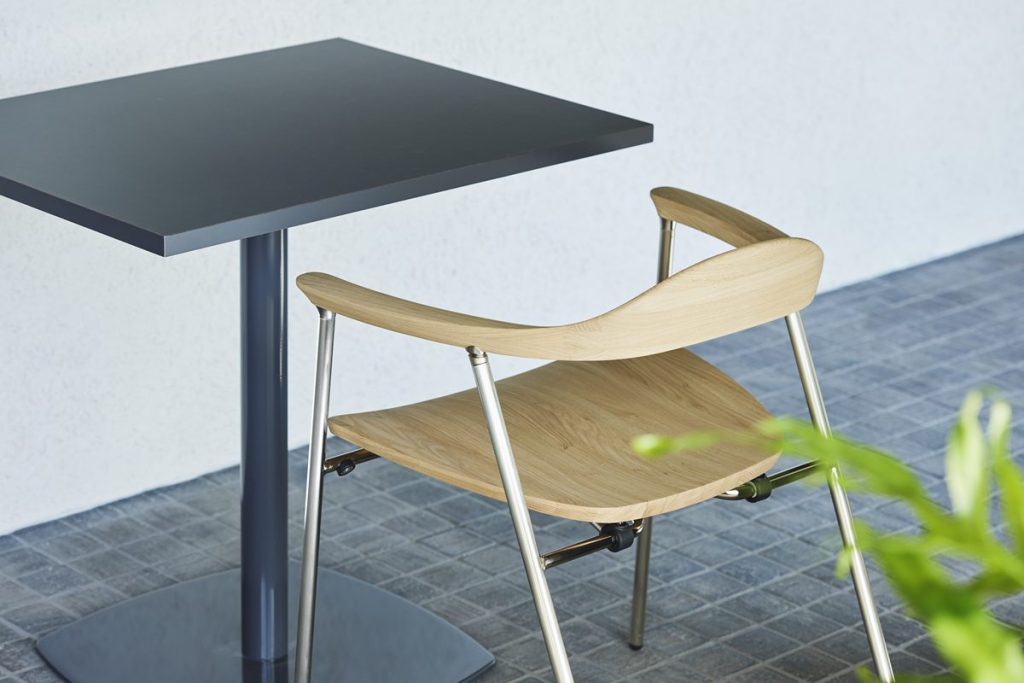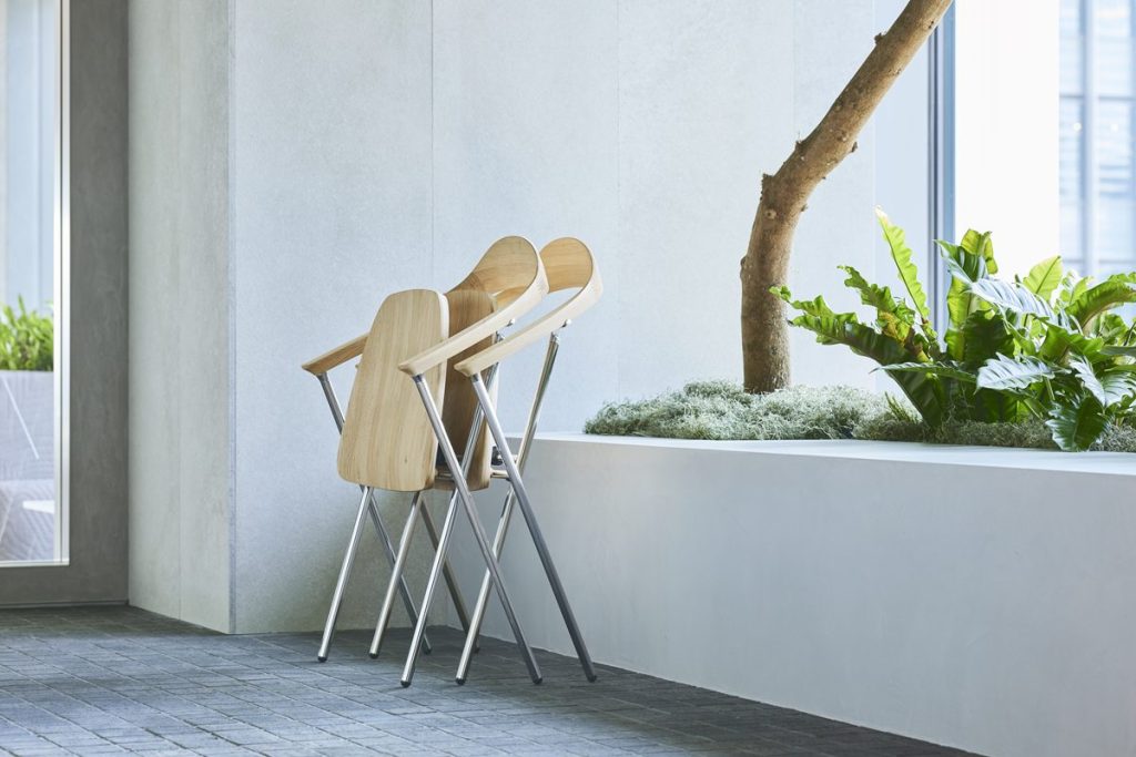強度面では、スチール製脚部とのハイブリッド構造を採用することで安定性を確保。同時に、クリ材の特性である軽さを、移動や設営のしやすさといった折りたたみチェア特有の利便性へと転化しているといいます。カリモク家具の木工技術による明るく滑らかな仕上げが、普遍的なフォルムに温かみと豊かな質感を与えているとしています。