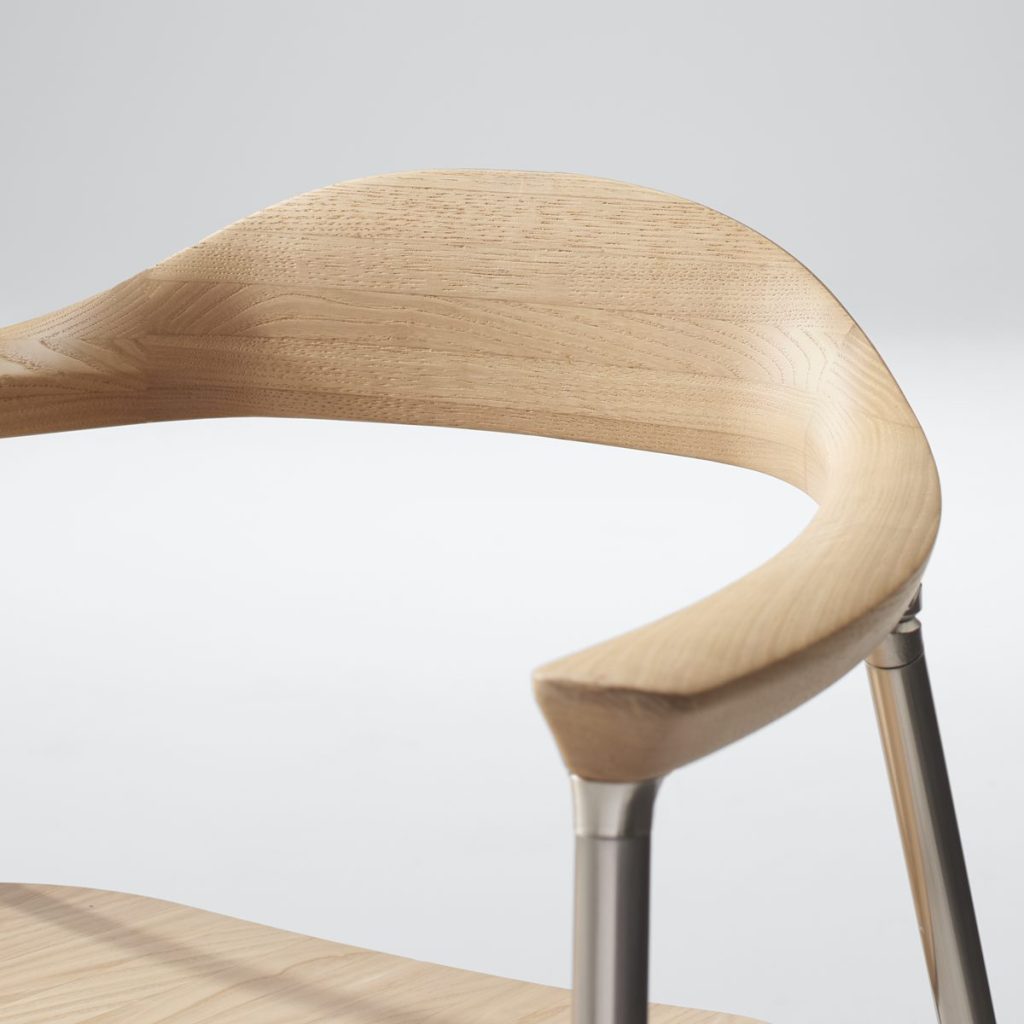 〈クロッサWOOD〉の背座には、比重が軽く力強い木目を持つ国産広葉樹のクリ材を採用しているといいます。クリ材はこれまで、強度が求められる椅子などの家具用材としてはあまり用いられてこなかった素材だとしています。