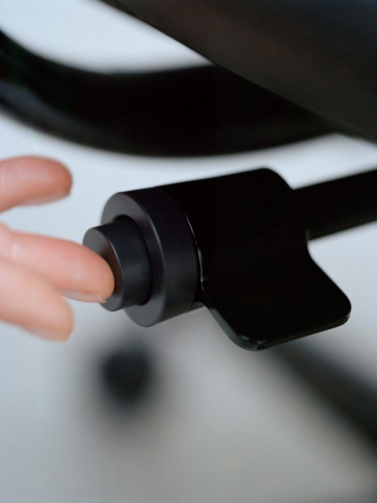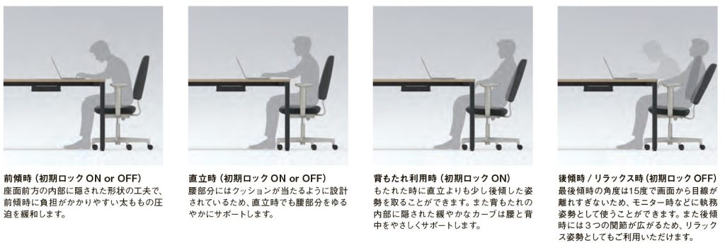 座面下の操作レバーを1本化し、昇降や背固定をシンプルに行える構造を採用。レバー先端のプッシュ式ボタンで背もたれの初期角度を固定でき、昇降脚タイプは、羽根つきレバー部分を回転させることで座面の高さを調整できるといいます。(90mm範囲)