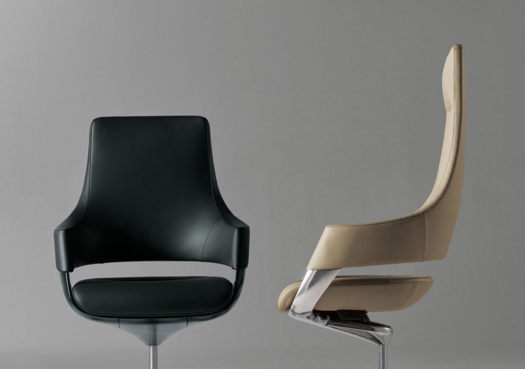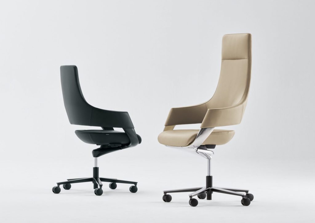 「Flotte」は、シンプルで無駄のない造形と、背もたれと座面の間に抜けのあるデザインで、軽やかさと気品を感じさせるカンファレンスシーティングだといいます。張材に本革を使用し、リクライニングや高さ調整などの機能も兼ね備えたとしています。