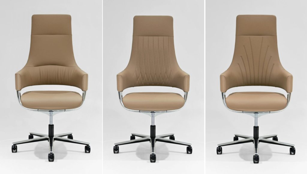 「Flotte ラグジュアリータイプ」は、オカムラが長年のチェア製造で培った張りの技術を生かし、「Flotte」の背もたれ部分の本革に加工を施すことで、上質感を引き立てるデザインにこだわったといいます。高度な張りの技術により実現したドレープデザイン1種と、本革に縫製を施したキルティングデザイン2種の計3種類。シンプルなシルエットに上質感を加え、エグゼクティブな空間に調和するとしています。