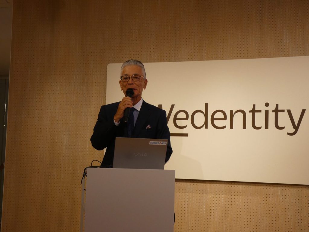 松本氏は「今見ていただきました通り「Wedentity」すなわちまざりつながる働き方を今回25階のオフィス改装を通じまして我々なりに実践していこうというところと、弊社のお客様に私たちが実際に働いている様子を見ていただこうというような環境を、オフィス改装を通じて設計デザインさせていただきました。まざりつながる環境を実現するために「バイオフィリア」、まるで大きな木の下の木陰の中で皆様が自然と集まり、会話が始まるような環境ができないかなというところでこういったインテリアのデザインをさせていただきました。
