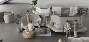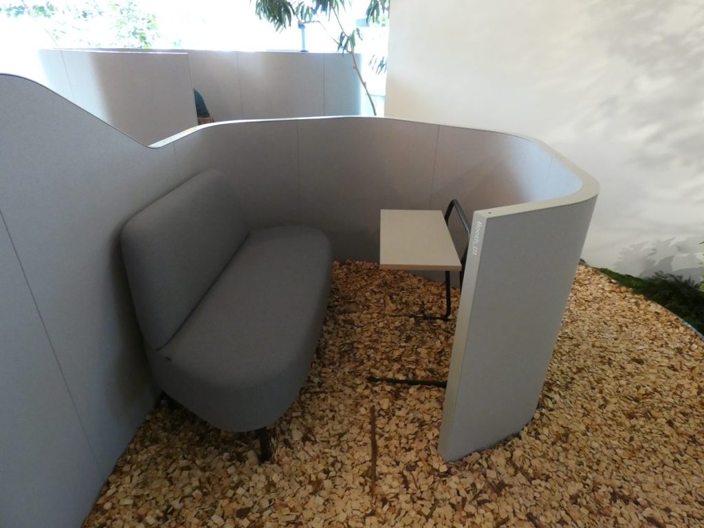 こちらでは、このようなオープンなパネルを中心に展開しておりますが、布で覆われたタイプもございます。今回、こちらで見ていただきたいのはただのパネルではなく、ただのソファーでもなく、空間を少し緩やかに仕切るような「まざりつながる」ための空間の一部にこの「YAA」を入れることで交流が生まれるというところです。