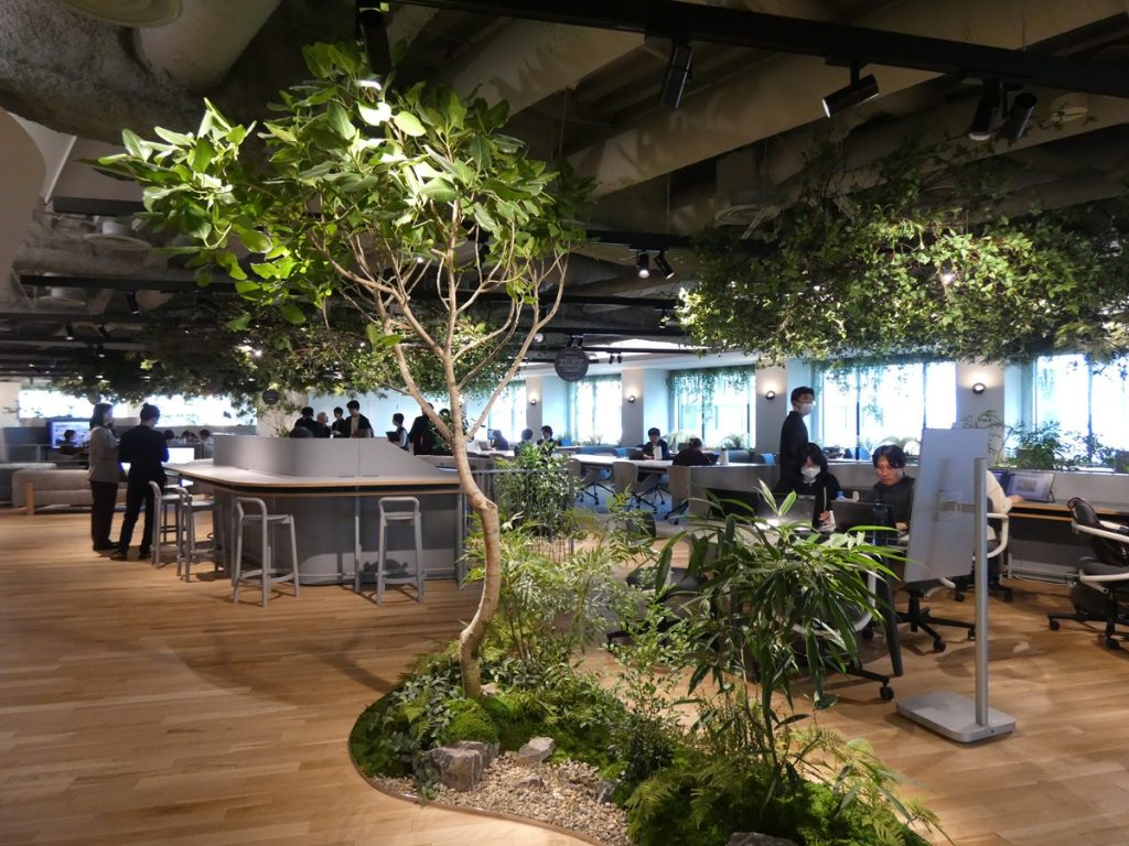 オフィス「We Labo」では、同社が掲げる「Wedentity」という働き方を実現するために人と人が混ざりつながる空間設計や家具のレイアウトを行ない社員自らが実践しているといいます。特徴の一つは自然の要素をふんだんに取り込んだバイオフィリックデザインに基づく空間設計。木陰に人が集まるように、植物や木漏れ日は働く人々の心理的な安心感やゆとりを生み出し無理のない交流を促すとしています。