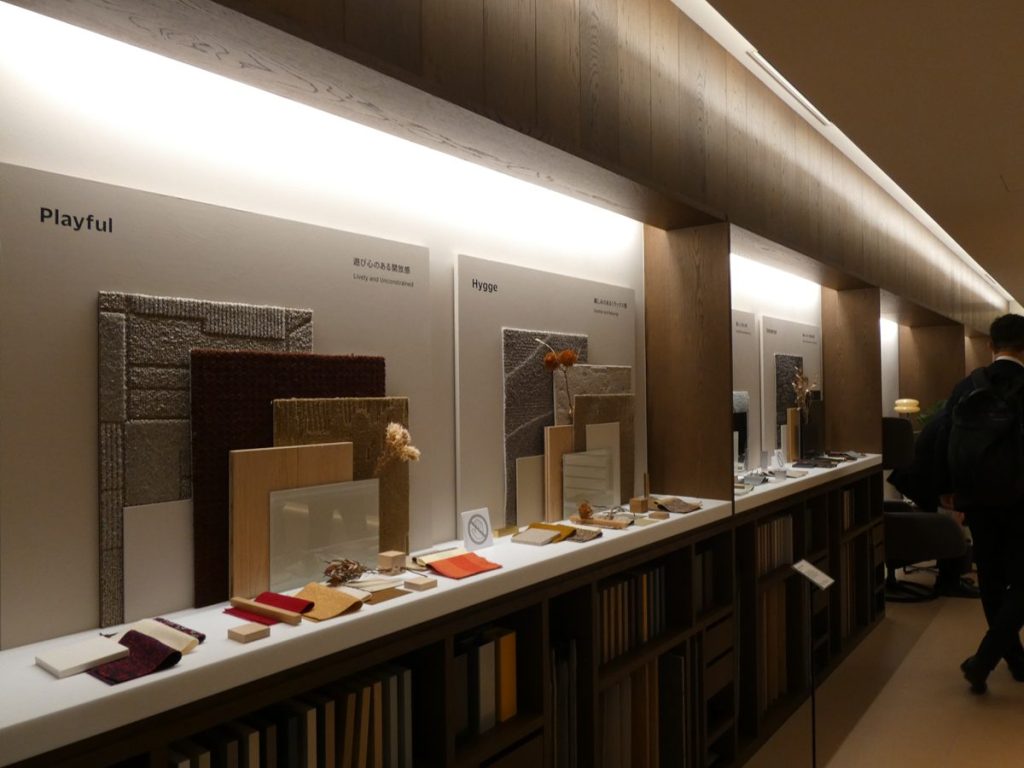 こちらの空間、このガーデンコートショールームの3階、「YAA」を展示している場所ですけれども、今回は新製品を品よく際立たせるために美術館のようなこういった空間といたしました。またこの先の方には、業界初として大きなCMFコーナー「マテリウム」というコーナーを設置しております。ここではさまざまな内装材とかオカムラの製品の素材を比較検討したり、色を決めようするためのコーナーとなっておりまして、これから設計事務所様ですとかデザイン会社様ですとか販売店のデザイナーの方々ですとか、もしくは私たちのデザイナー、このような方々がまざりつながって新しい協創の場として機能することを期待しています。