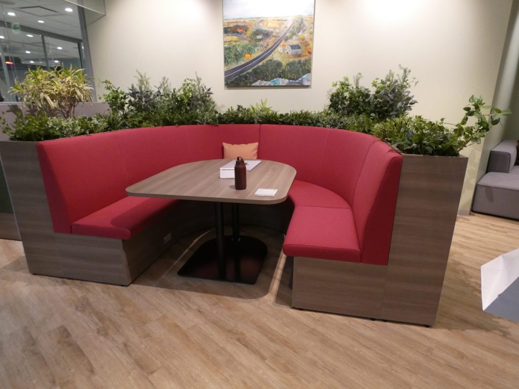 食堂空間に適した製品、ユニットソファシリーズ「Bresta(ブレスタ)」のラウンド形状のソファで構成されるU字ブースセット、カフェチェアシリーズ「Amita(アミタ)」の樹脂タイプ、「Lives Meeting Table(ライブスミーティングテーブル)」のハンギングタイプ