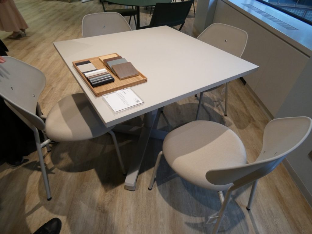 「Lives Meeting Table」ハンギングタイプ。こちらはイスをテーブルにかけることが可能で、食堂やカフェなどで床の清掃がしやすいということが特徴の製品です。これら3つはいずれも最近大流行りの食堂という空間に向いている商品となっております。