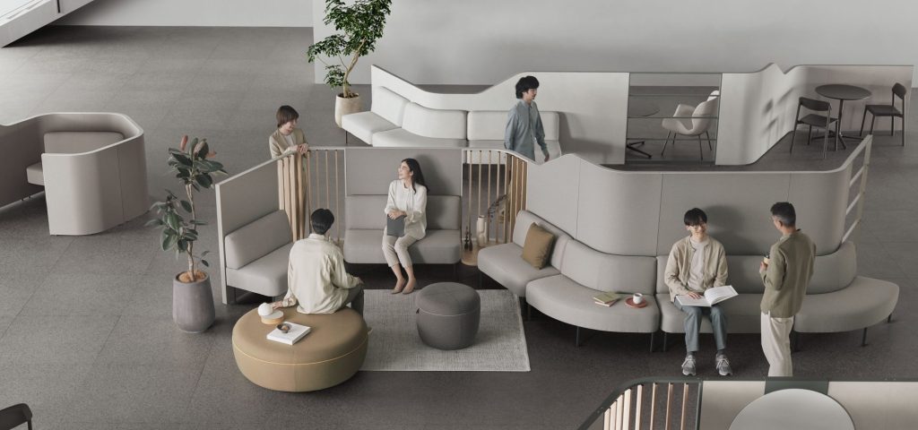 こちらでは、このようなオープンなパネルを中心に展開しておりますが、布で覆われたタイプもございます。今回、こちらで見ていただきたいのはただのパネルではなく、ただのソファーでもなく、空間を少し緩やかに仕切るような「まざりつながる」ための空間の一部にこの「YAA」を入れることで交流が生まれるというところです。