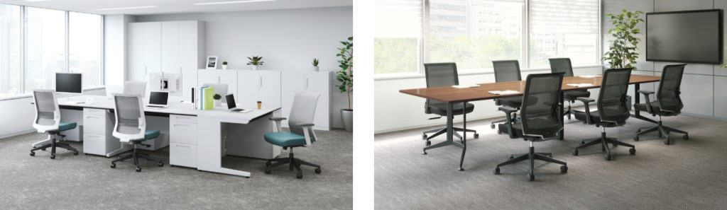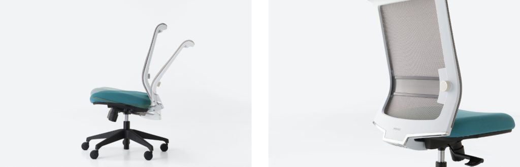 快適な作業環境をサポートする機能として、ロッキング角度調整機能、ランバーサポートを標準搭載。オプションで、可動肘、ハンガーを追加することが可能だといいます。抜け感のあるメッシュとすっきりとしたデザインはさまざまな空間になじみ、執務室はもちろん会議室・応接室にもマッチするといいます。バリエーションは、本体色が白と黒の2色、背のメッシュが2色、座が6色展開だとしています。