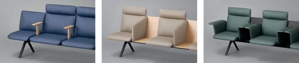 ベンチタイプ、スタンダードタイプ、ハイバックタイプのほか、インクルーシブデザインの視点を取り入れたT字肘や隣席と仕切れるパネル肘、ゆったりと過ごせるスワン肘など、さまざまなバリエーションを用意したといいます。これらを同一空間にレイアウトすることで、来院者が自分の過ごしたい席を選択できるとしています。