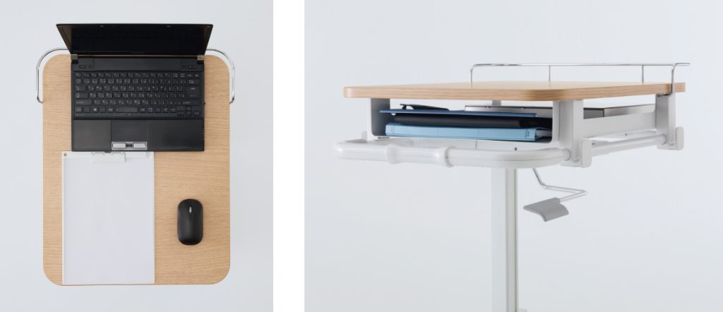 トレーは、大容量の大型トレーにさらにミニトレーを追加し、用途に合わせて分けて収納することができるため、これまで以上に物品の整理がしやすくなったといいます。また天板のサイズを従来よりも大きくすることで、ノートPCと縦型のクリップボード、マウスを同時に置くことができ、手元の情報を確認しながらPC入力がスムーズに行えるとしています。天板の下にも広い収納スペースを設けているため、天板周りの書類や機器をすぐに収納でき、作業スペースの確保にもつながるといいます。