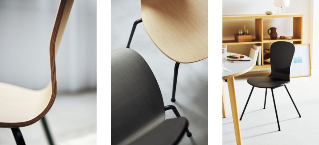 丸みのある座面形状により、立ち座りの際に脚が抜けやすいだけではなく、会話の中心に体を向けやすく、コミュニケーションを円滑に促すといいます。また、背のラインに沿ったS字形状で快適な座り心地を実現するとしています。