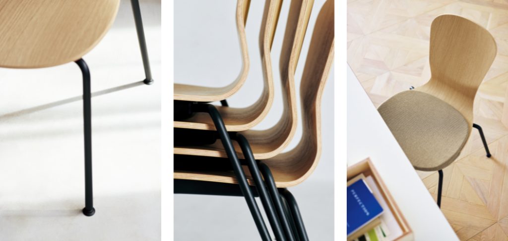 また、床との引っ掛かりやびびり音を低減した脚先の樹脂キャップにより、立ち座りも自然に行うことができるように設計したといいます。スタック脚の場合は床に4脚まで重ねることができるため、コンパクトに収納も可能さとしています。