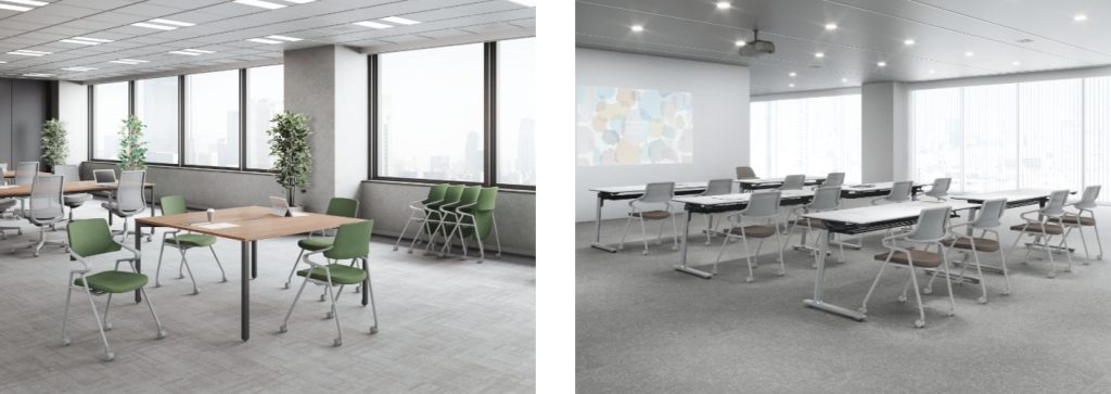 「R Chair」は3種類の背もたれ形状と豊富なカラーバリエーションで、多様な空間デザインと調和するといいます。メモ台や荷物棚が装備できるなど、会議用イスとしての汎用性も向上させているとしています。