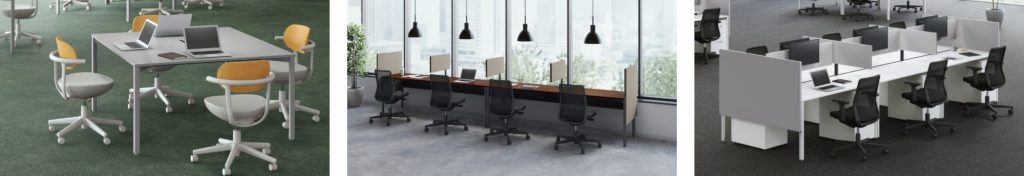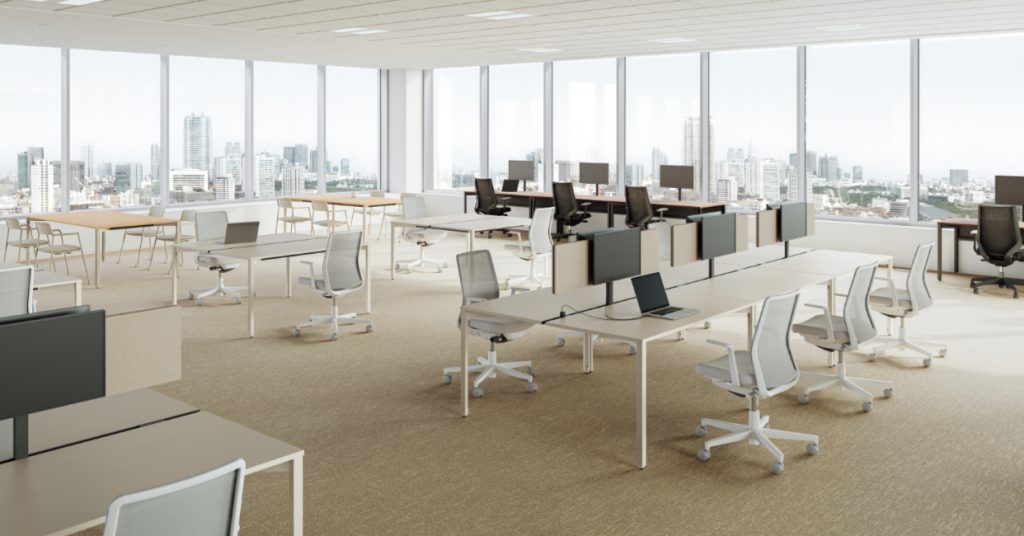 脚元は空間になじむロック付きのキャスターを搭載。テーブルを複数台並べても脚部が干渉せず、すっきりとした空間を実現するといいます。働き方に合わせてフレキシブルにセッティングでき集中ワークから交流まであらゆる働き方に対応するとしています。