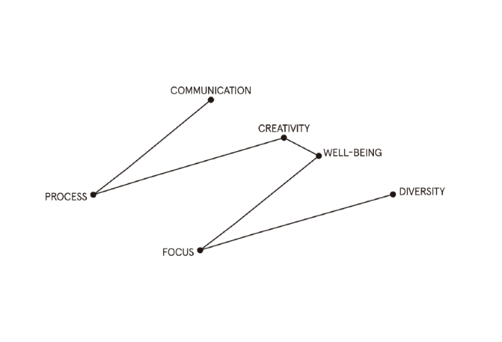 シーン展示の中では、その家具がカルチャーにもたらす要素を点と線で紹介しているといいます。チームや個人が大切にする価値観の点をつなぎ合わせることで、顧客それぞれの「企業カルチャー」が見えてくるといいます。「カルチャーの設計図」を描くための新たな視点、アイディアとして役立てることができるとしています。