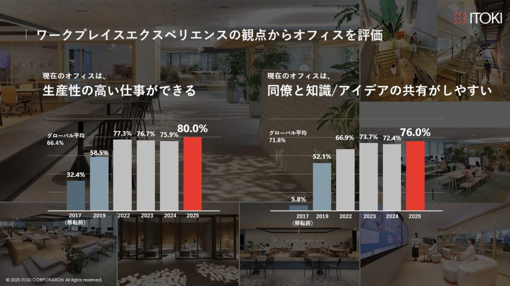 本年度の調査で、ITOKI DESIGN HOUSE TOKYOは複数の指標で世界平均を上回り、働く体験の質が国際水準で優れていることが示されたとしています。特に「現在のオフィスは生産性の高い仕事ができる」という項目では、昨年の自社スコア75.9%やグローバルベンチマーク66.4%をさらに上回る80.0%となったといいます。ワークプレイスが社員の業務成果に直結している点が明確に評価されているとしています。