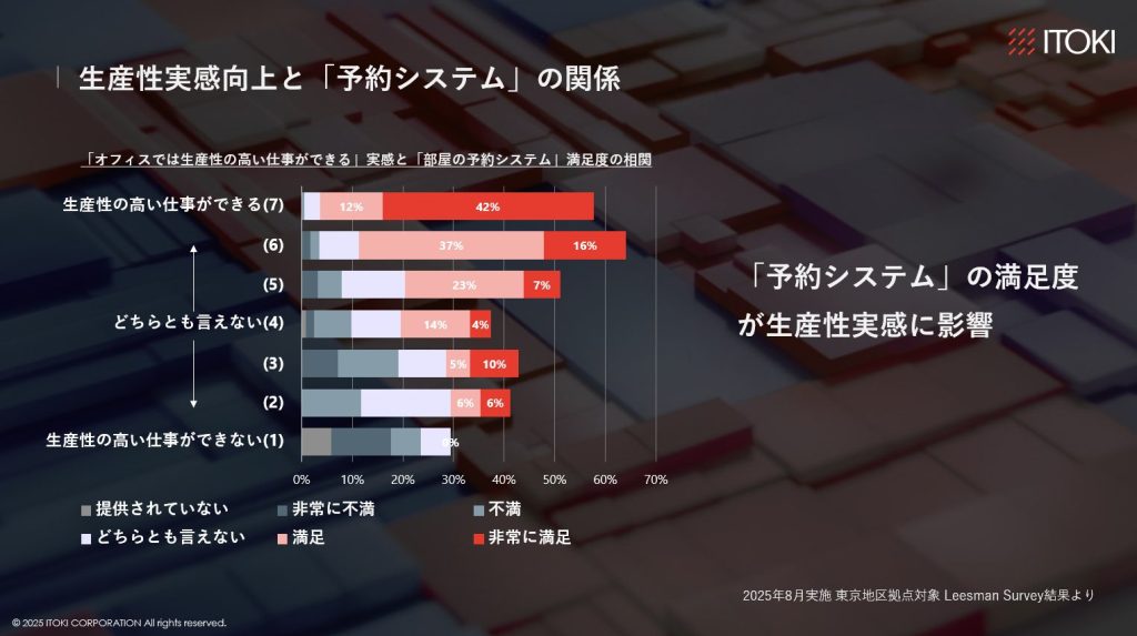 社員が必要な時間に、適切なスペースをスムーズに利用できるようになったことで、働きやすさに直結する日常のストレスが軽減され、会議室予約システムは生産性実感と明確な相関が見られる結果となったとしています。