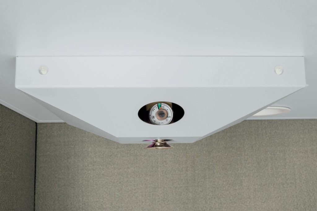 天井に熱感知式の消火装置を設置。点検口からは指示圧力計の指針が正常範囲にあるか確認できるといいます。