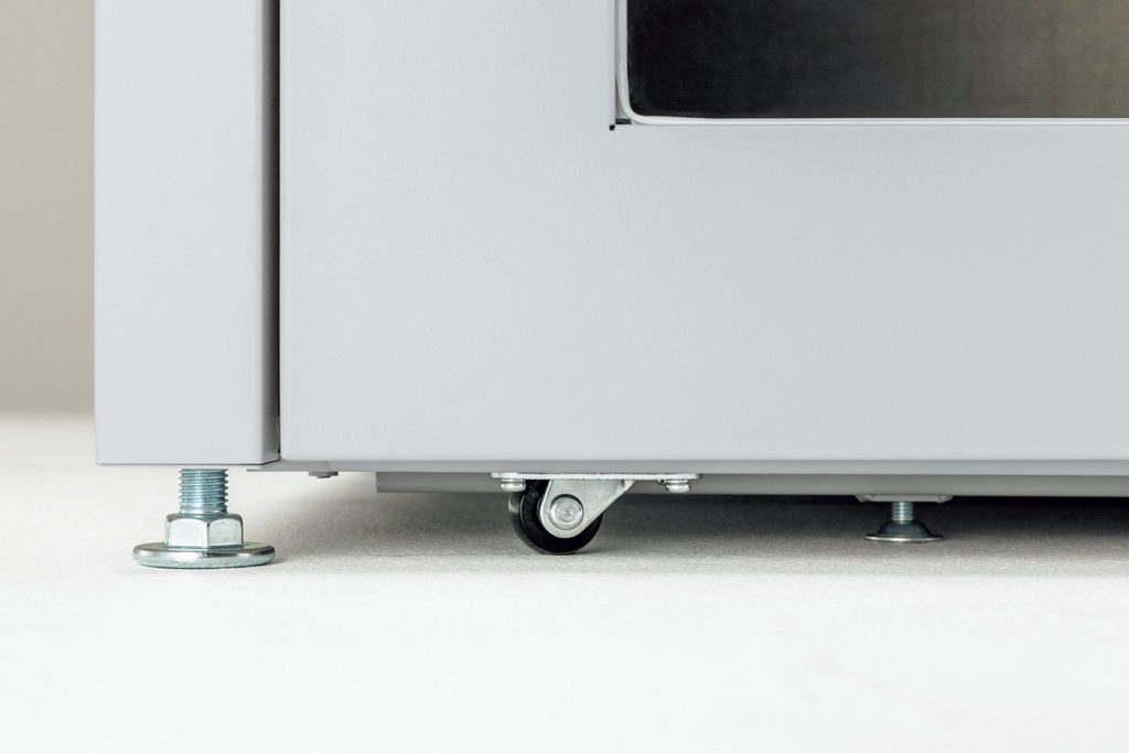 低床のキャスター付で、段差の少ないフロア内を移動可能だといいます。設置後はアジャスターでレベル調整し、位置を固定するとしています。