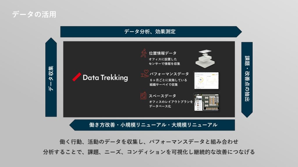 ITOKI DESIGN HOUSE SHIGAでは、空間を一度整えて終えるのではなく、使われ方をデータで捉え、改善を重ねていく仕組みとして「Data Trekking」を導入しているといいます。人の動きや空間の利用状況を可視化する位置情報データ、働きやすさやエンゲージメントを把握するサーベイデータ、レイアウトや用途を管理するスペースデータを組み合わせて分析。これまでの知見にデータを掛け合わせ、より確かな根拠に基づく改善サイクルを実現しているとしています。