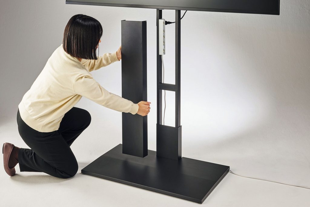 同製品は、壁寄せですっきりと省スペース設置できるディスプレイスタンドだとしています。