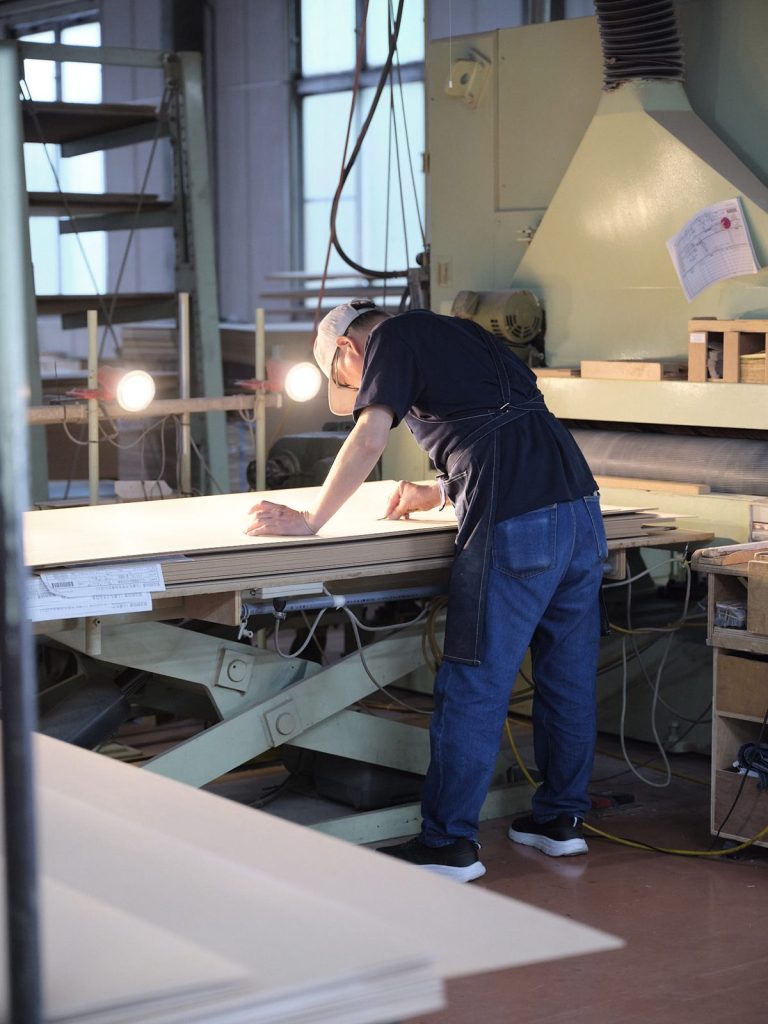 同プロジェクトにおいて、Devon Turnbull氏が描く緻密な音響空間の設計を現実のものとしたのは、カリモク家具が培ってきた「素材への深い理解」と「木工加工の知見」だといいます。特に「突板(つきいた)」の技術は、スピーカーにインテリアとしての美しさを与え、木材ならではの豊かさを空間にもたらしているとしています。自社製作の突板張材は、木目がもたらす自然な起伏と深みを残しつつ、柔軟な曲げ加工にも耐えうる絶妙な厚みで製作。接着の工程では、木目が自然な連動を生むよう、一枚ずつ手作業で配置するとしています。隣り合う材の色差を限定する厳格な自社基準を設けることで、木材特有の個体差を活かした調和を生み出すといいます。生産ラインでの再現性を確保しながら、唯一無二の静謐な佇まいを実現したとしています。
