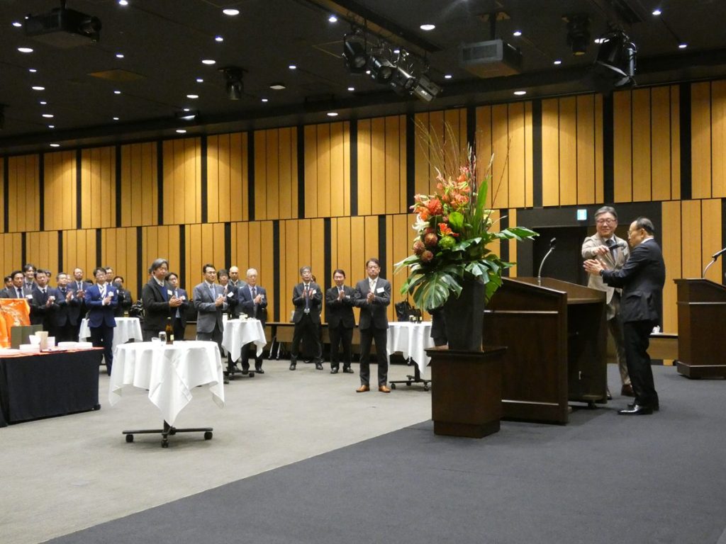 先ほど中村会長から我々の業界が前年比で11%伸びているという話があり、誠に喜ばしいことではあるのですが、その後に続けて言われたのが物品としての家具の売上は4%の伸びである。それ以外のものが成長を支えてくれたということだと思うのですが、何故まず11%も伸びたのか。実はオフィス家具というのが果たしている役割が昔とだいぶん違ってきて、私は社内でオフィス家具は実はメディアではないかという話をしています。会社が変わろうとしているときにそれをシンボリックに社員に伝える。社長さんが何回も同じことをいうより、他所と違うオフィスをつくること。これによってうちの会社は違う会社になりたいのだということを社員に伝える。もしくは社外から来られるお客様にそれを気づいていただくというメディアとしての役割が非常に強いのではないかと考えています。自分の会社もそういうつもりで思い切り飛んだオフィスをつくってみようと随分工夫をしてまいりましたけれども、それなりに効果がありました。昔のオフィス家具の担当は総務部長さんとか用度の部長さんとかがご担当でしたが、近ごろはオフィスイコール社長マターになってきている。これが私たちの成長を支えてくれたのだと思います。ところが先ほどの話ですが、モノの売上は4%しか伸びていない。それは何かというと私たちの業界の努力がまだ足りないということだと思います。もっと新製品を、胸がときめくような新製品を出してそれを私たちが需要創造、これもJOIFAの重要な役割だと思っていますが、この需要創造、需要をつくっていく作業を併せてやっていって、本当に根っこの部分で10%、20%伸びるような業界になってくれたらありがたいなと思っています」などと述べ乾杯の発声を行いました。