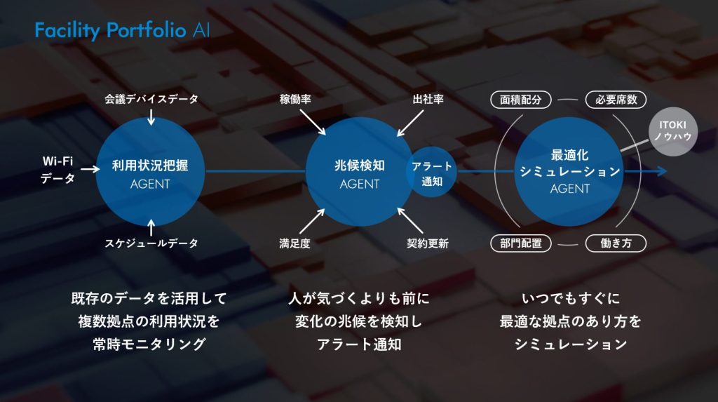 また、その中核となるOffice3.0の新ソリューション「ITOKI OFFICE AI AGENTS」を開発し、年内より順次提供開始予定であることも同時に発表しました。同サービスは3つのAIソリューションで構成され、顧客企業が自ら高度なオフィス投資判断と働き方のハイサイクル化を実行できる仕組みを構築するとしています。