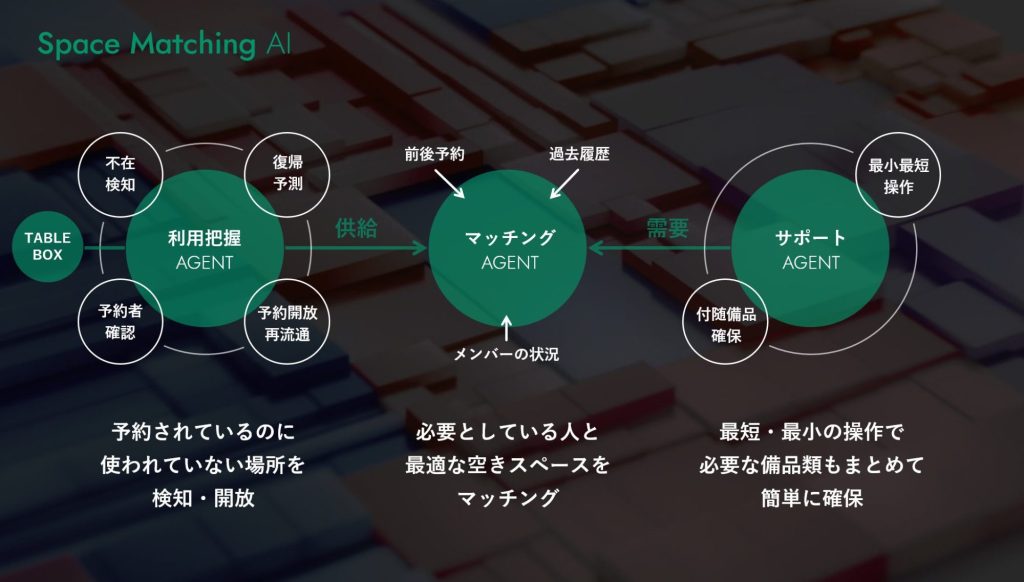 在席情報や行動傾向、利用履歴をもとに、実際に空いているスペースをリアルタイムで判定し、利用者に即時案内するといいます。利用されていない予約は自動的に解放され、需要に応じて再配分される仕組みにより、会議室や席の不足によるストレスを軽減し、空間の稼働率向上を実現するといいます。物理空間とデジタルデータを連動させた点が大きな特長だとしています。