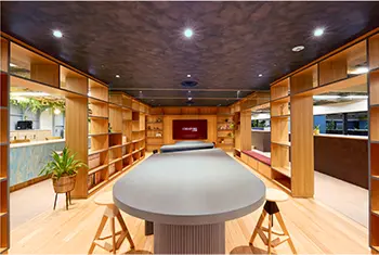 床面には、前進する船をイメージしたデザインを採用し、波形を模した意匠を取り入れることで、「新たなビジネスの船出」というコンセプトを空間全体で表現しているとしています。